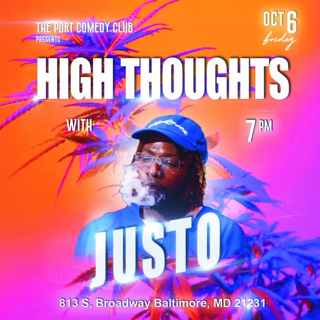 High Thoughts is the most fun crowd interactive show you will attend! Ticket holders are encourage to smoke cannibus BEFORE the show! Then as you enter the show ticket holders will be asked to write down on a piece of paper a topic that you want the comedians to joke about aka your "High Thought." This can happen with 1,2, or as many as 3 Comedians on stage at the Same Time! Show will be headlined by Justo featuring special guests!