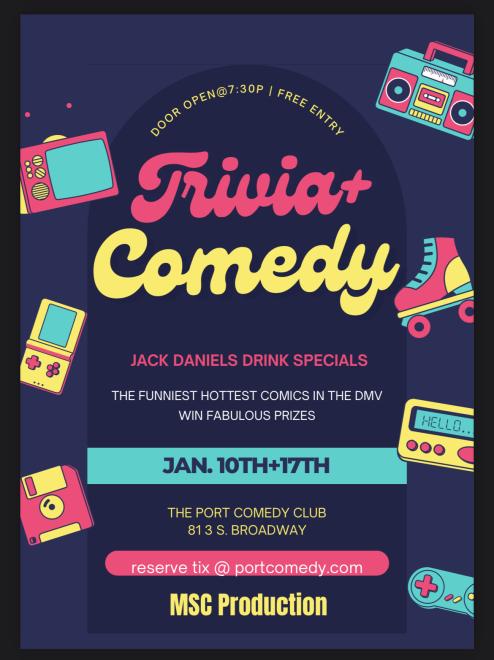 Are you smart and fun? Are you smart and have fun friends? Are you fun and have smart friends? If you answered yes to any of these questions, then grab your crew and come down to Trivia+Comedy at the Port Comedy Club! Trivia+Comedy is a night of quirky trivia and hilarious stand-up comedy from the best comics in the region and your hosts Mike and Garrett. Conquer the quiz master and win fabulous prizes sponsored by the club and your friends at Jack Daniels! Play, Laugh, Win!!